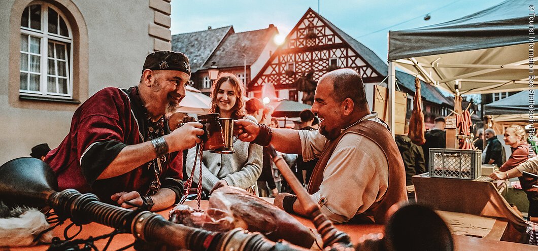 Das beliebte Festspektakel in Bad Staffelstein verwandelt den Marktplatz jedes Jahr am letzten Juliwochenende in eine lebendige Mittelalterwelt. Das Thema „Mittelalter“ wird hier nicht nur dargestellt, sondern mit ganzem Herzen gelebt: Überall ist der historische Charakter des Altstadtfestes spür- und erlebbar. Spielleute, Marketenderinnen und Handwerker verschiedener traditioneller Gewerke präsentieren sich in authentischen Gewändern und lassen vergangene Zeiten wieder aufleben. Sobald die Klänge der Drehleier ertönen, der Duft von frisch Gegrilltem durch die Gassen zieht und die Handwerker lautstark ihre Waren anpreisen, fühlt man sich mitten ins historische „Damals“ versetzt.