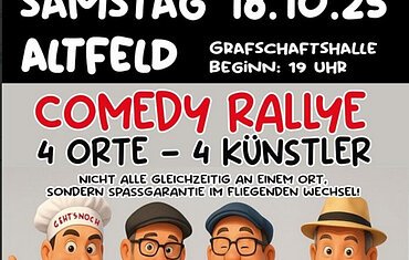 18.10.25Marktheidenfeld, Spessart-MainlandPremiere in Altfeld! Am Samstag, 18. Oktober 2025 heißt es: Lachen ohne Ende – die Comedy Rallye macht Station im Spessart! - 4 Bühnen - 4 Künstler ...Kirchenmusik in den Haßbergen