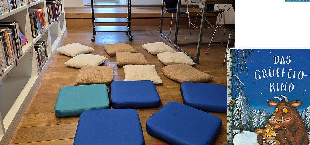 Einmal im Monat lesen wir in der Stadtbücherei Schweinfurt im Ebracher Hof Kindern ab 4 Jahren eine Geschichte aus einem Bilderbuch vor. Das Besondere daran: Die Bilder zur Geschichte werden im Großformat in einem Kasten präsentiert und können von den Kindern die ganze Zeit über betrachtet werden, während vorgelesen wird.