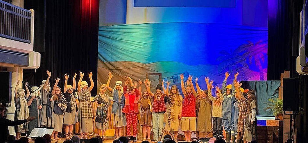 Kinder im Alter von 9 bis 14 Jahren führen jährlich ein Kindermusical unter Leitung des Dekanatskantors Göttemann in der Stadthalle Haßfurt auf.