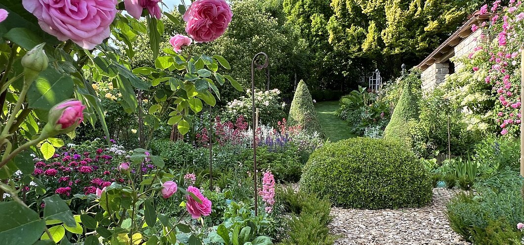 Lustwandeln Sie teils unter schattigen alten Bäumen und entdecken Sie die Vielfalt an Gehölzen und Stauden. Viele Sitzgelegenheiten laden zum Verweilen ein. Besonders Rosenfans kommen jetzt auf Ihre Kosten.