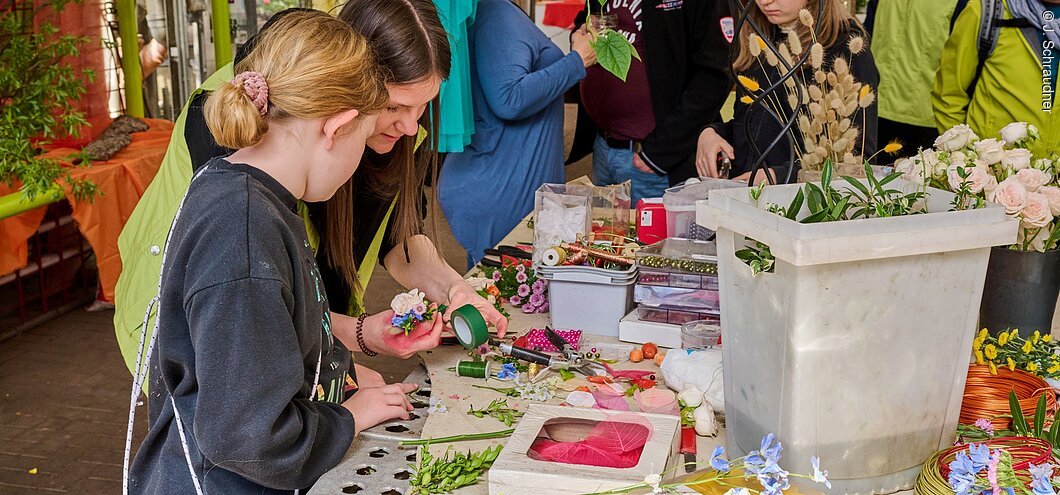 Mit Aktionen wie Pflanzenquiz, Käfersuche oder dem Bepflanzen eines eigenen Salattöpfchens wird Gartenwissen spielerisch vermittelt und die Freude an der Natur geweckt. Zum Toben gibt’s die Hüpfburg.