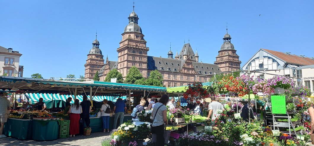 Der Aschaffenburger Wochenmarkt am Schloss ist eine traditionsreiche Veranstaltung vor malerischer Kulisse und lässt sich urkundlich bis ins 12. Jahrhundert nachweisen. Mit seinem frischen, facettenreichen und qualitativ hochwertigen Warenspektrum ist er ein gern besuchter Einkaufstreffpunkt. Der Verkauf findet Mittwoch und Samstag statt. Die Marktzeit beginnt um 7 Uhr und endet um 14 Uhr. Innerhalb der Marktzeit können die Händler Ihre Waren anbieten. In der Kernzeit von 8 bis 13.30 Uhr halten alle Markthändler Ihr Angebot für Ihre Kundschaft bereit. Je nach Saison bietet der Markt ein vollständiges Sortiment an Produkten: Obst, Gemüse, Spargel, Kräuter, Oliven, Blumen, Pflanzen, Gestecke, Essig, Öl, Obstsäfte, Bio-Produkte, Süßwasser- und Meeresfisch, Fleisch, Wurst, Wildprodukte, Käse, Molkereiprodukte, Eier, Nudeln, Antipasti, Brot und Gebäck, Weine, Destillate, Brände, Liköre, Imkereiprodukte, Kaffee, Imbisse und Snacks und vieles mehr.